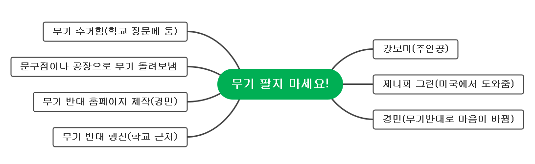 그리고 경민이가 평화 모임에 참여한 이유는 보미랑 민경이 때문에 장난감 총을 갖고 놀지 못해서 다른 할 놀이가 없어 그냥 참여한 것 같았다. 그래도 경민이는 무기 반대 홈페이지를 만드는 큰 역할을 했다.